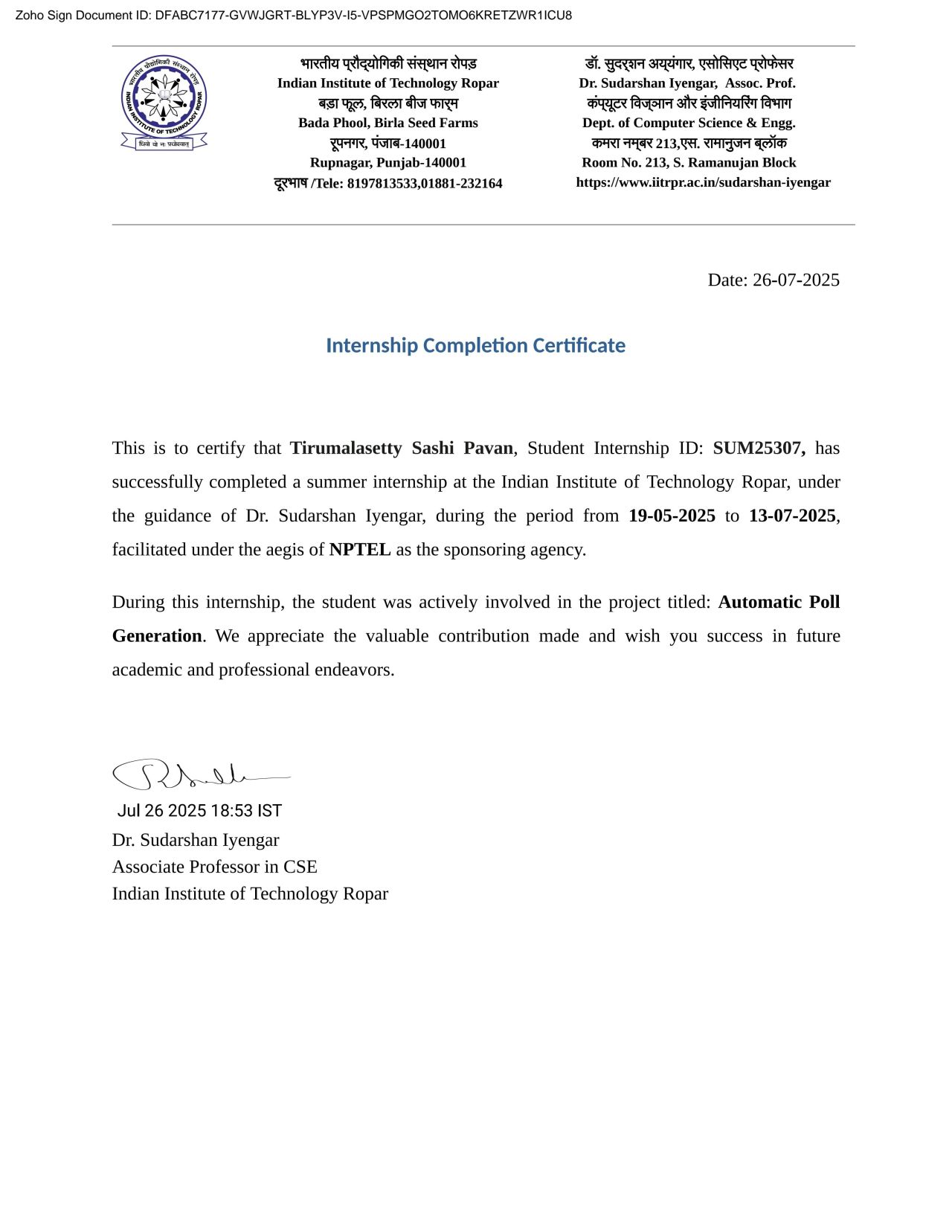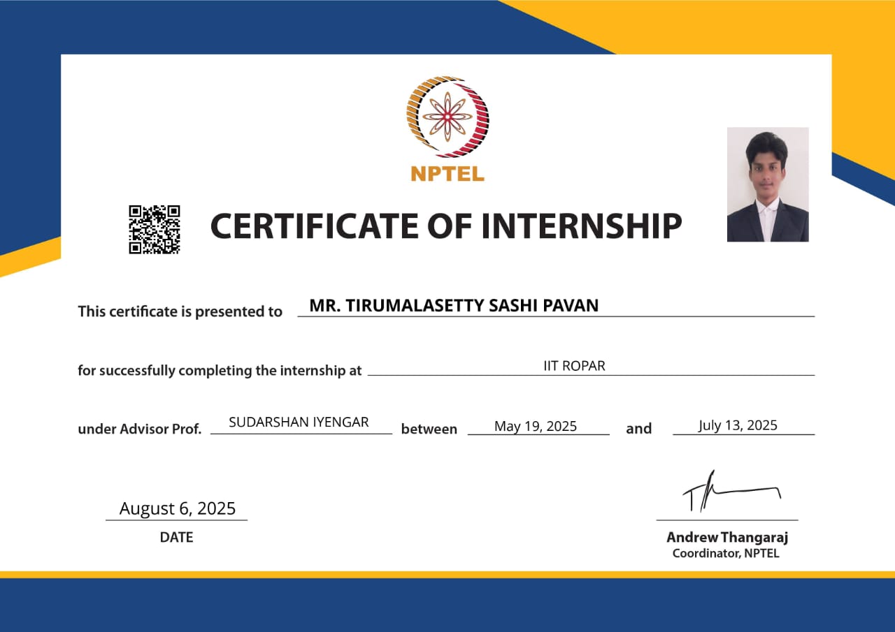 Completed an 8-week NPTEL Summer Internship at Indian Institute of Technology, Ropar under the guidance of Prof. Sudarshan Iyengar. As part of Team 6 (Backend), worked on building a real-time, AI-powered Automatic Poll Generation System, collaborating with a diverse and talented team.