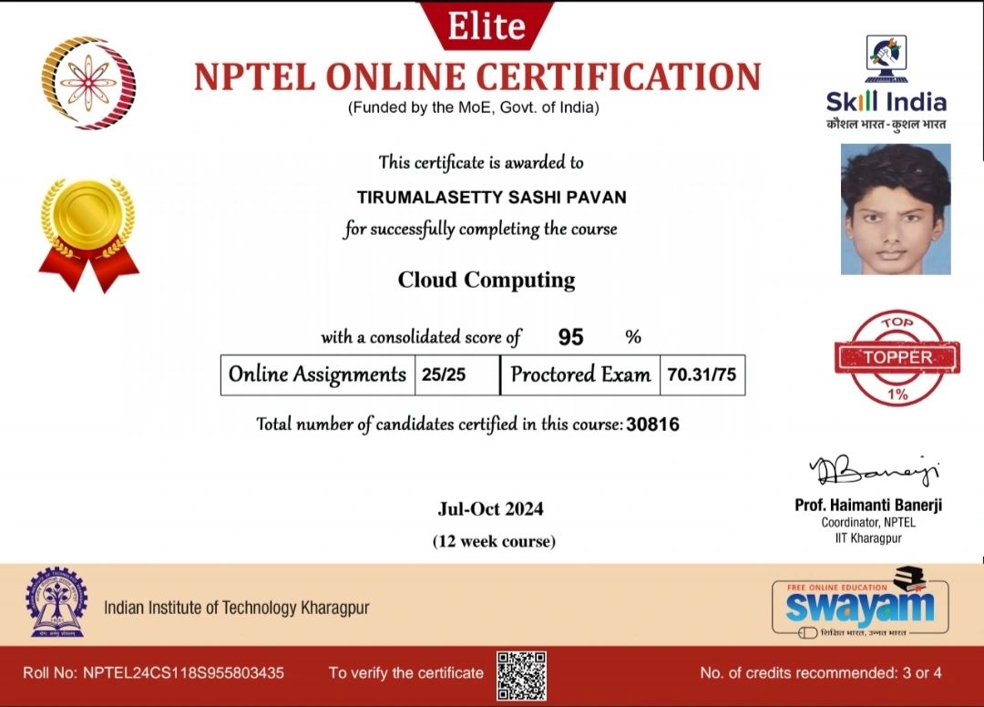 Achieved 95% in Cloud Computing certification by NPTEL (IIT Kharagpur).