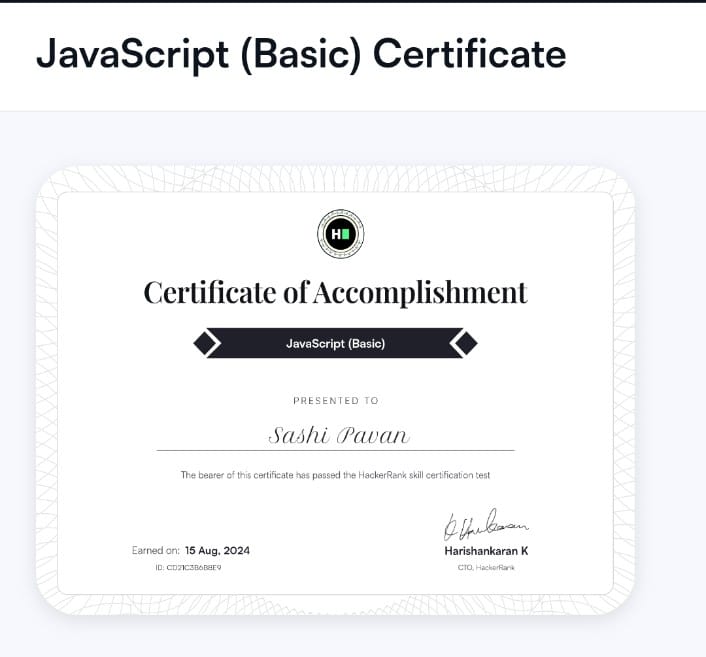 JavaScript Proficiency Earned certification demonstrating expertise in modern JavaScript programming